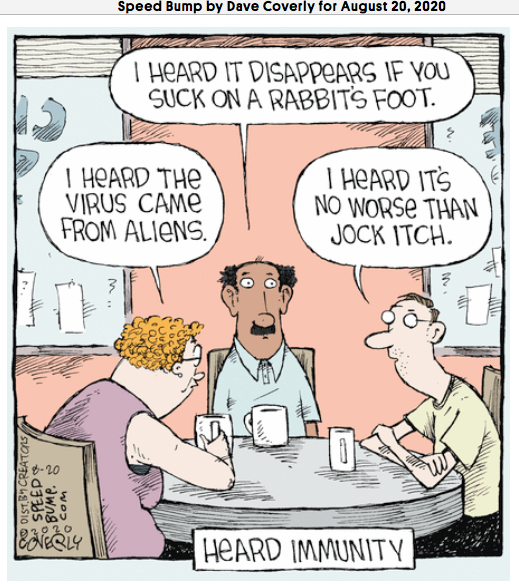 The claim made earlier by Gustavo, that the population needs 70% exposure to the virus to obtain herd immunity, does not seem to be the case. Given T-cell exposure to similar coronavirus RNA strands in earlier outbreaks it seems that a good chunk of populations may have immunity even without exposure to COVID-19. There are certainly results turning up where people appear to be immune even though they have no anti-bodies to this virus. As a result there have been some articles published that propose that herd immunity for COVID-19 may be occurrng even with a population exposure of only 20%, although that will obviously differ between national populations.