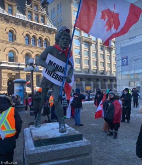 They put a “Mandate Freedom” sign on him, tied a Canadian flag around his neck like a cape, and put an upside down Canadian flag in his hand.