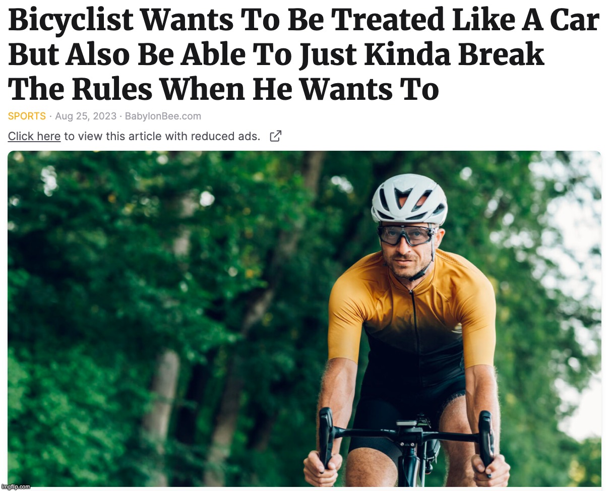 The cyclists on the Auckland waterfront have been pissing me off again as they persist in not using the new multi-million dollar bike paths built for them and instead stick to the car lanes as before. This is because they like going fast while forcing car drivers to sweat about hitting them while they don’t have to care about hitting some old biddy on her e-Bike. As such the Babylon Bee hit hard on my behalf.