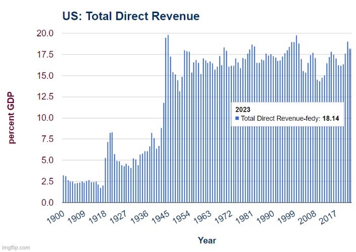 Re the tax situation, aside from the fact that the “rich” can and will employ armies of accountants and lawyers to avoid Bomber’s taxes there’s also the fact that higher tax rates and other new taxes that hit not-rich people also fail. Here’s the graph I put up the other day from my post on how the US cannot tax its way out deficits and debt…