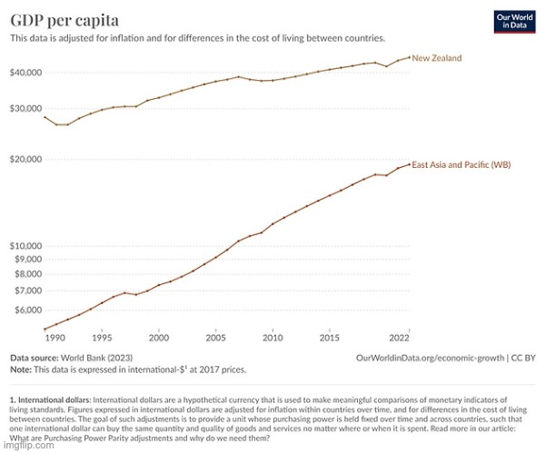 Starting with New Zealand, courtesy of the blog Down To Earth Kiwi, by economist Robert MacCulloch here’s a graph showing NZ’s economic growth over the last thirty years compared to that of the East Asia and Pacific nations in terms of GDP per capita.