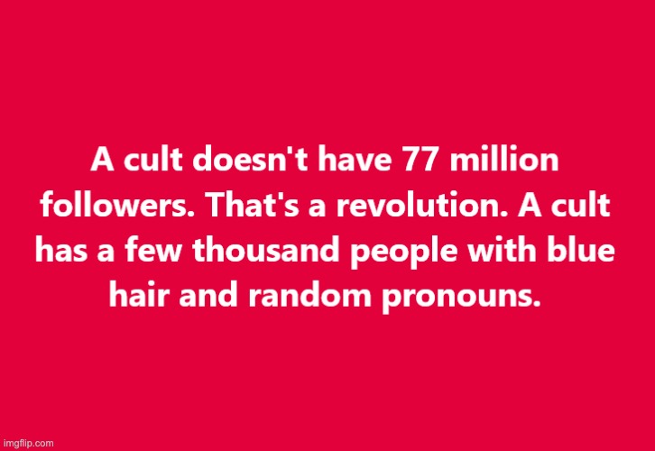 Yawn. That the best you can do? No cultist will ever admit they’re in a cult, cultist. Stalin and Mao both had cults larger than yours. Get real.