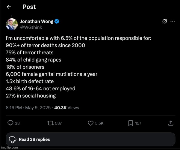 That’s the Islamist Independent MP Adnan Hussain, who then took it further by crying “racism”, which promptly saw him getting kurb-stomped by people about the difference between race and religion. I’m sure he well knows that of course; this is just another tactic like the ones CAIR uses in the US to try and shut down criticism of Islam. Of the many responses, this one from a Jonathon Wong (probably a White Supremacist) was the most brutal.