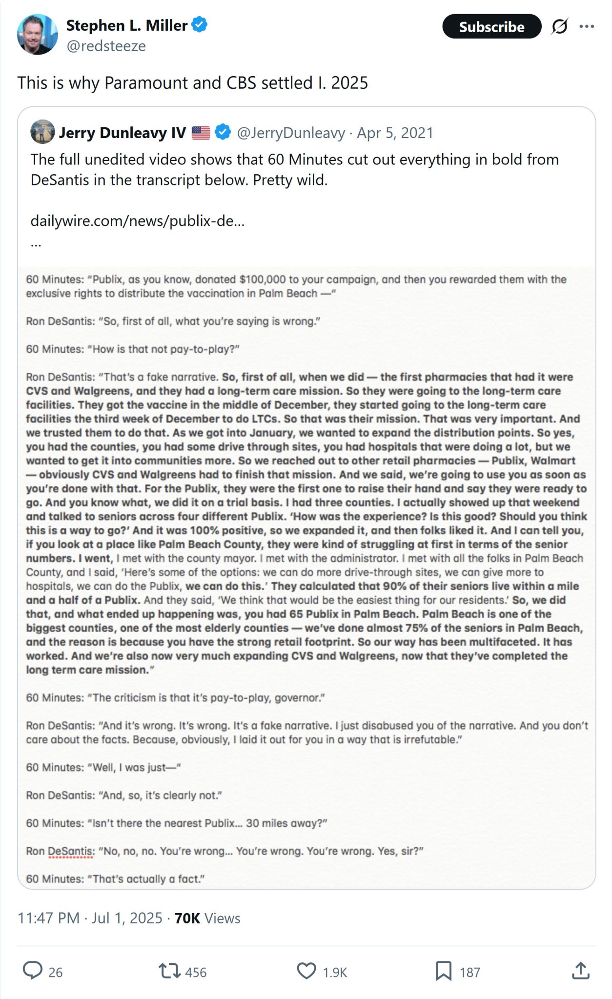 Another humiliation was that CBS now has to adopt “the Trump Rule”. a mandatory rule to release complete, unedited transcripts for interviews with presidential candidates, which they refused to do in this case, and which also shows up in the opposite situation, such as this 2021 interview with Florida Governor Ron DeSantis.